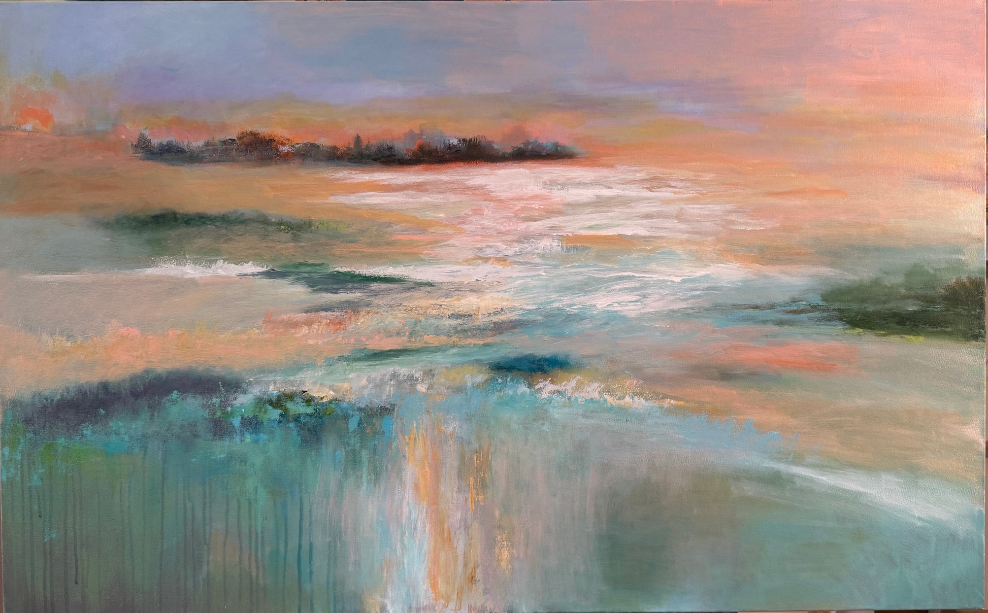 Experience the mesmerizing beauty of Glowing Sunset. This stunning art piece captures the fiery hues of the sun reflecting on water. Measuring at 30x48 inches, it is painted with high-quality acrylic on canvas.