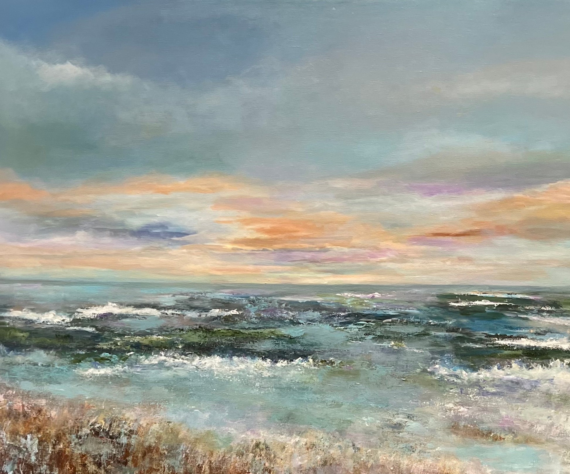 This abstract art piece, inspired by the sunrise at Jekyll Island, is a captivating display of colors and textures portrayed through acrylic on a 24x30 canvas.